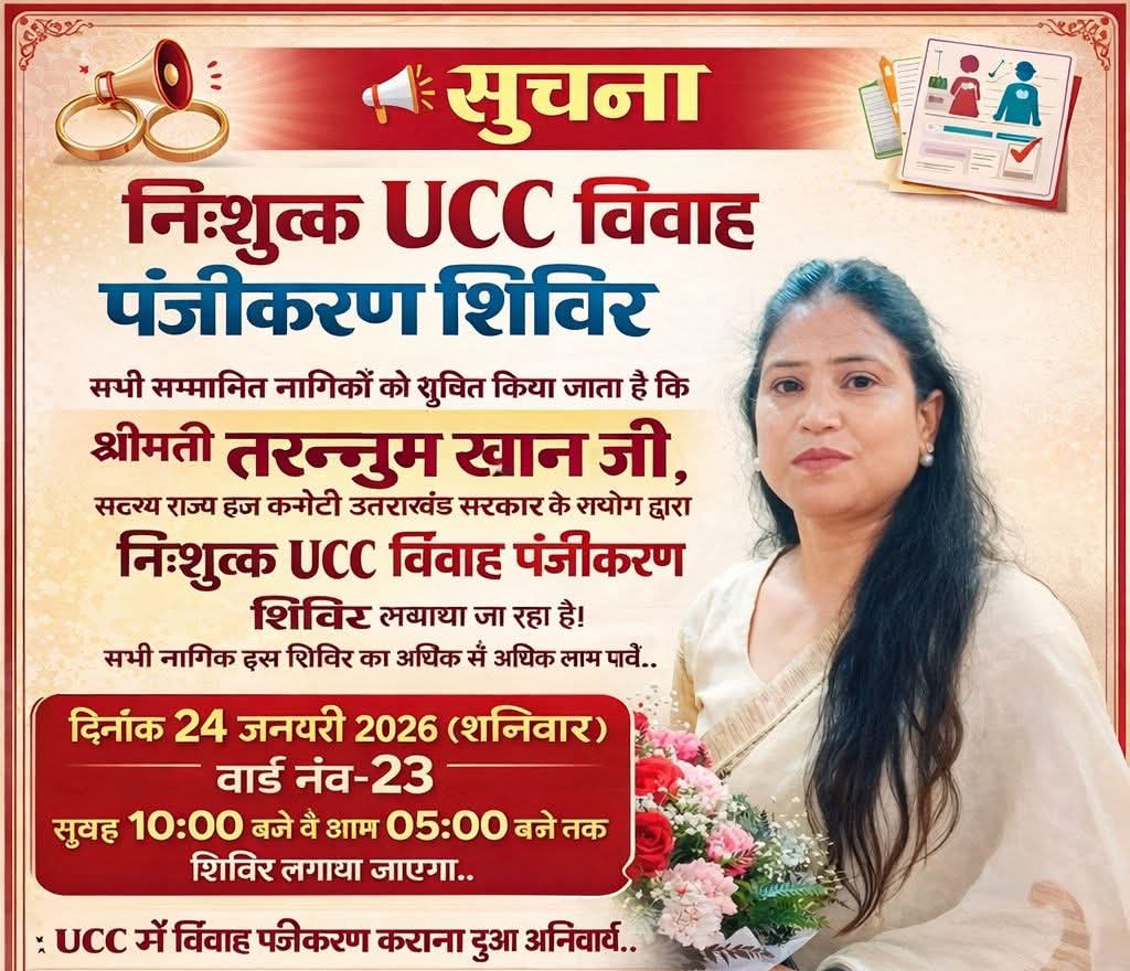 उत्तराखंड सरकार द्वारा लागू यूनिफॉर्म सिविल कोड (UCC) के तहत विवाह पंजीकरण को अनिवार्य कर दिया गया है। इसी क्रम में वार्ड नंबर-23, बनभूलपुरा हल्द्वानी में निःशुल्क UCC विवाह पंजीकरण शिविर का आयोजन किया जा रहा है।
