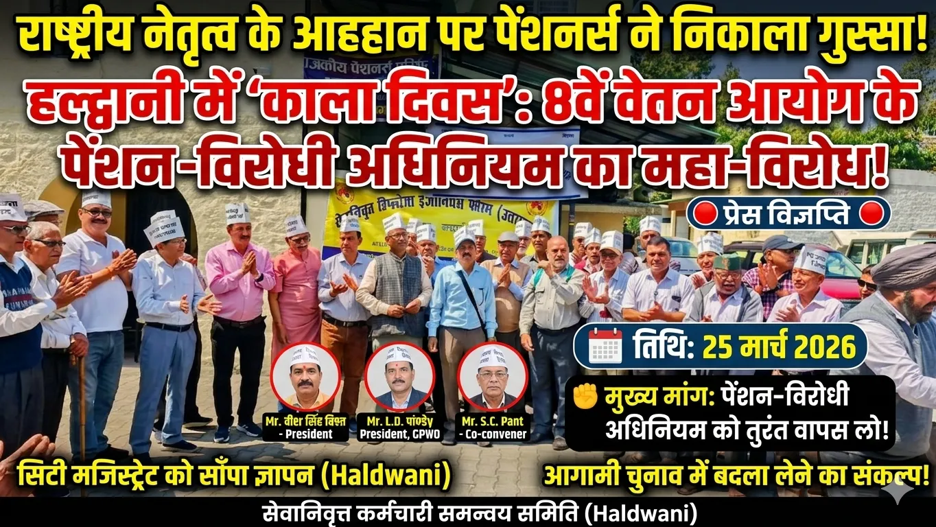 आज दि. 25/3/2026 को राष्ट्रीय नेत्रत्व के आहवान पर हल्दानी में उत्तराखण्ड कार्मिक समन्वय समिति के बैनर तले विरोध दिवस का आयोजन किया गया। जिसमें हल्द्वानी स्थित सैकड़ों पेंशनर की भागीदारी रही। जिसमे डिप्लोमा इंजीनियर्स संघ पेंशनर परिषद तथा गवर्मेंट पेंशनर्स वेलफेयर संगठन के सदस्यों लिया गया।