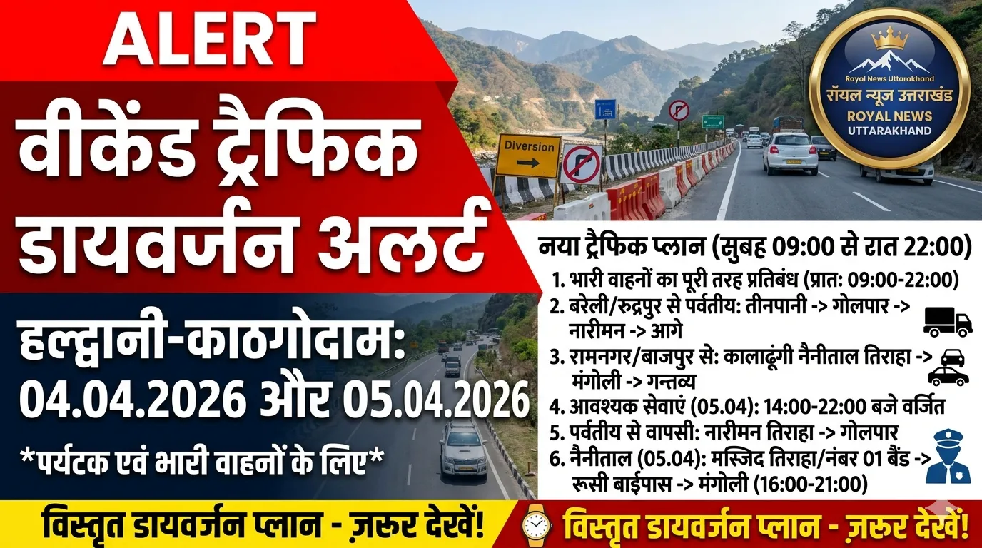 हल्द्वानी-काठगोदाम क्षेत्र में वीकेंड पर बढ़ती पर्यटकों की भीड़ को देखते हुए पुलिस प्रशासन ने 04 अप्रैल 2026 (शनिवार) और 05 अप्रैल 2026 (रविवार) के लिए विशेष यातायात एवं डायवर्जन प्लान लागू किया है। यह प्लान दोनों दिन सुबह 09:00 बजे से रात 10:00 बजे तक प्रभावी रहेगा।